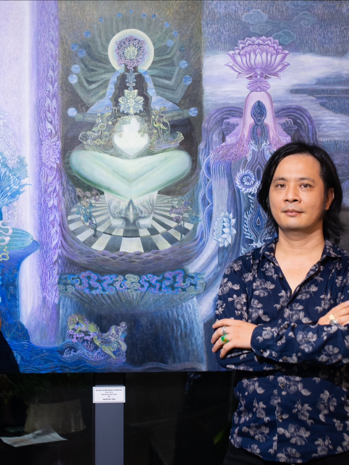 Nghệ sĩ Nguyễn Đức Hùng và tác phẩm của mình tại triển lãm. Ảnh: Palm Artspace