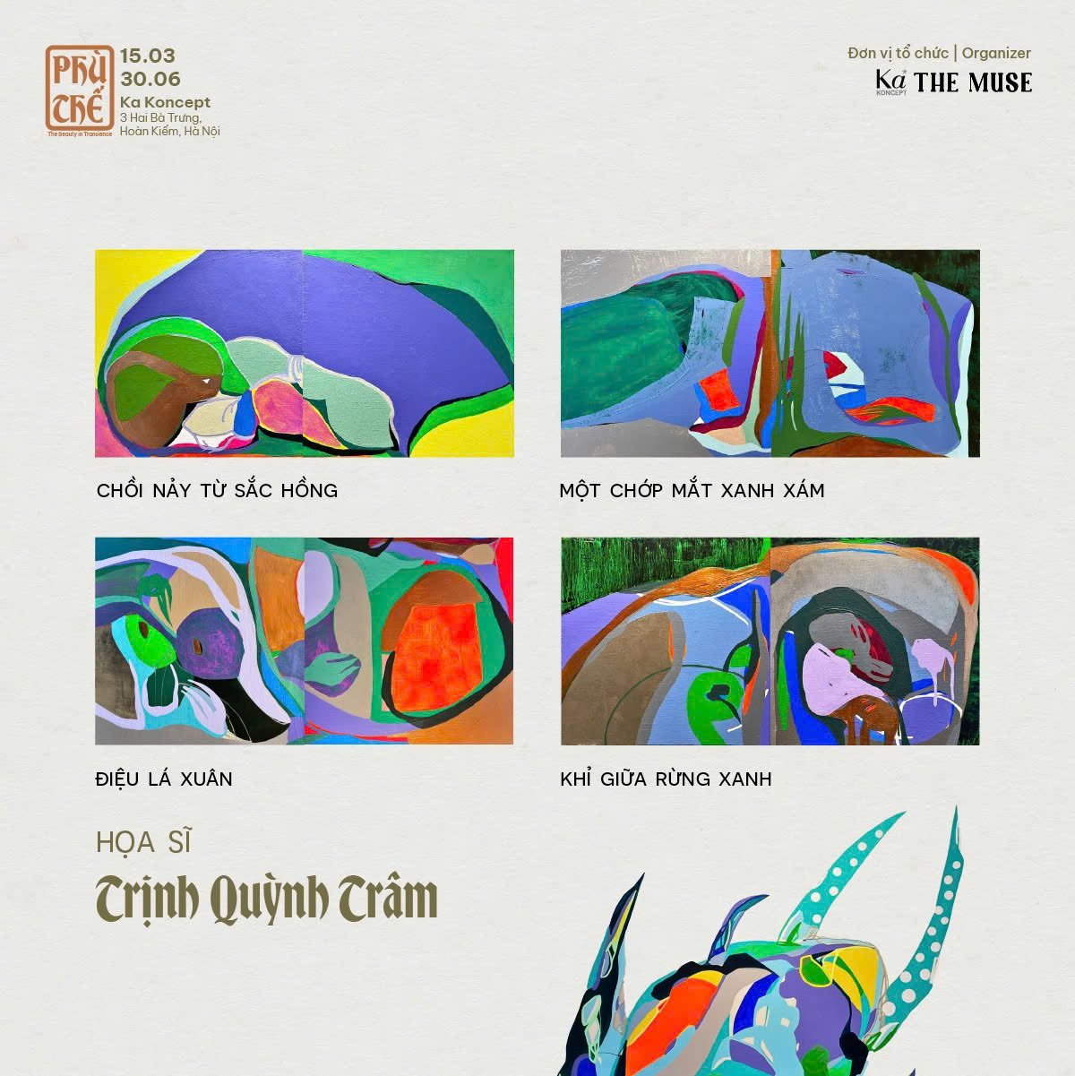 Triển lãm quy tụ bốn nghệ sĩ: Đỗ Duyên, Trịnh Quỳnh Trâm, Đan Quốc Chính và Điêu khắc gia Trần Thược. Họ là những người mang đến những góc nhìn khác biệt, song đều khai phá vẻ đẹp của sự vô thường và kết nối nội tâm qua nghệ thuật.