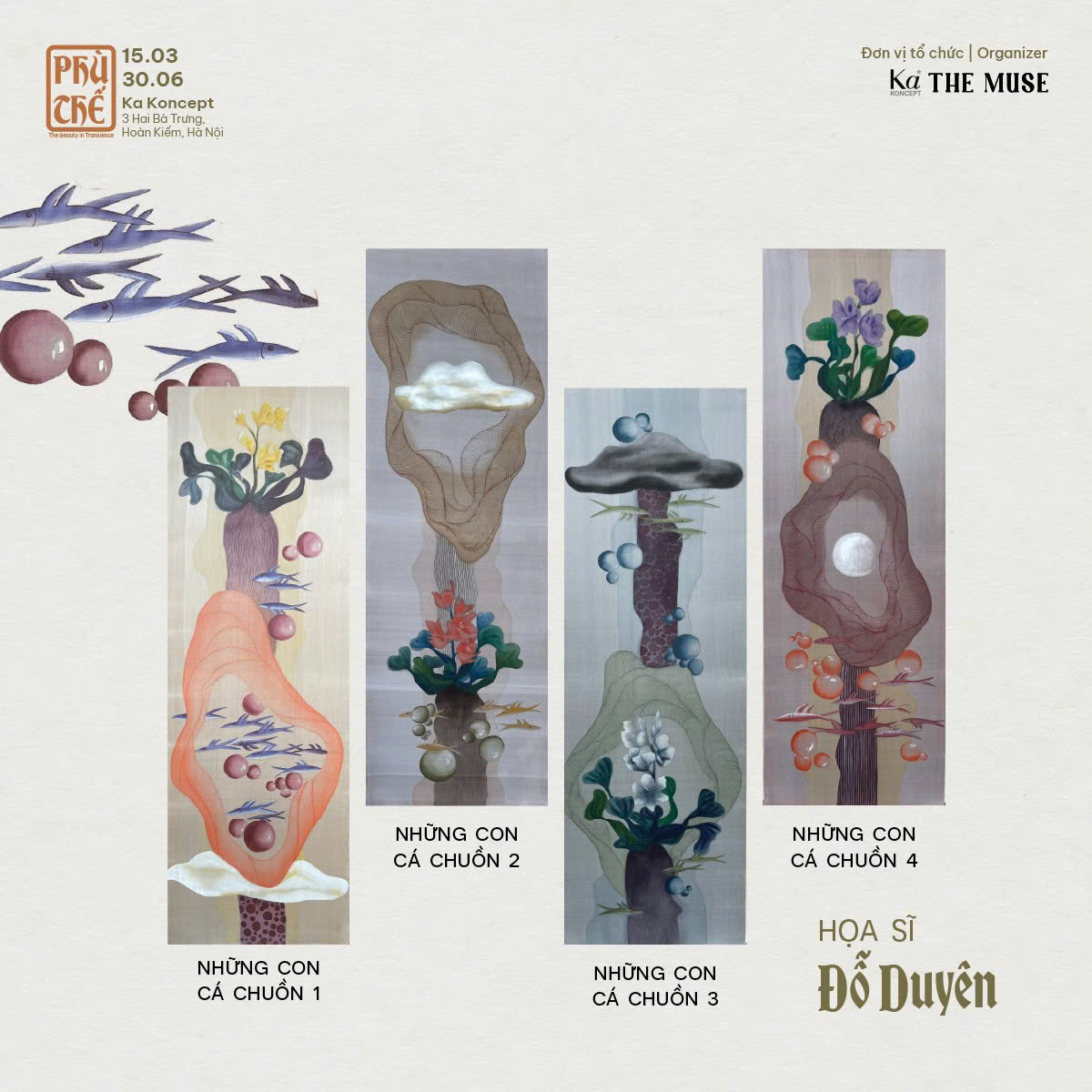 Series “Những con cá chuồn” của hoạ sĩ Đỗ Duyên trong triển lãm Phù Thế. Nguồn: Ka Concept