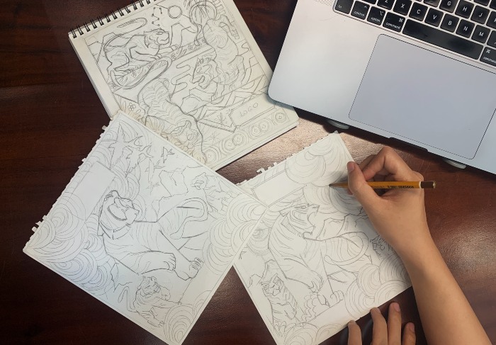 Dự bắt đầu khi Trà Quế studio mang đến cho tụi em cái brief đầu tiên, ban sơ nhất về hình ảnh của một con hổ sau những khó khăn, vất vả, nó vẫn dũng mãnh bước về phía trước, khám phá hành trình tiếp theo. Sau khi nhận được chiếc brief này, Xôn Xao tụi em thấy hứng thú quá và bắt đầu đào sâu hơn với Trà Quế Studio. Cuối cùng ra hình ảnh của 03 con hổ với dáng đứng rất là mạnh mẽ.