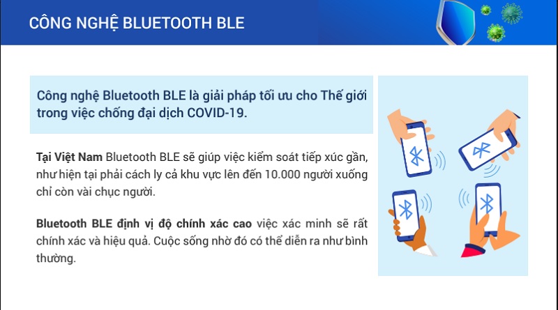 Bluezone là giải pháp ứng dụng công nghệ định vị Bluetooth năng lượng thấp BLE (Bluetooth low energy). Các smartphone được cài đặt Bluezone có thể giao tiếp với nhau trong khoảng cách 2m, ghi nhận sự tiếp xúc gần, vào lúc nào và trong bao nhiêu lâu.