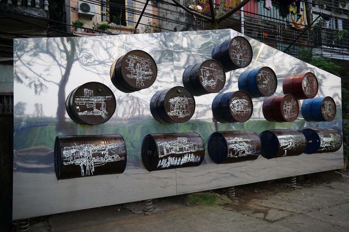 Tác phẩm ” Nhà nổi” được làm từ thùng phi tái chế của Hoạ sĩ Lê Đăng Ninh