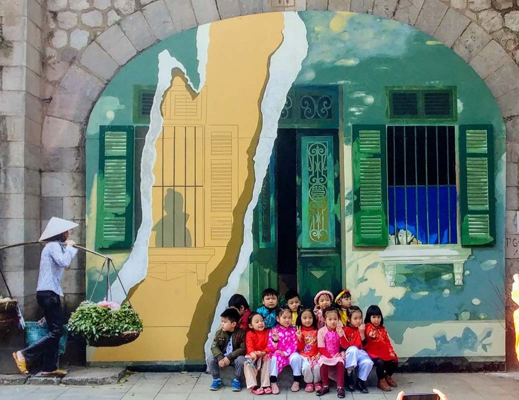 Các bé mẫu giáo chụp ảnh với tác phẩm “Nhà số 63 phố Phùng Hưng” của Họa sĩ Trần Hậu Yên Thế
