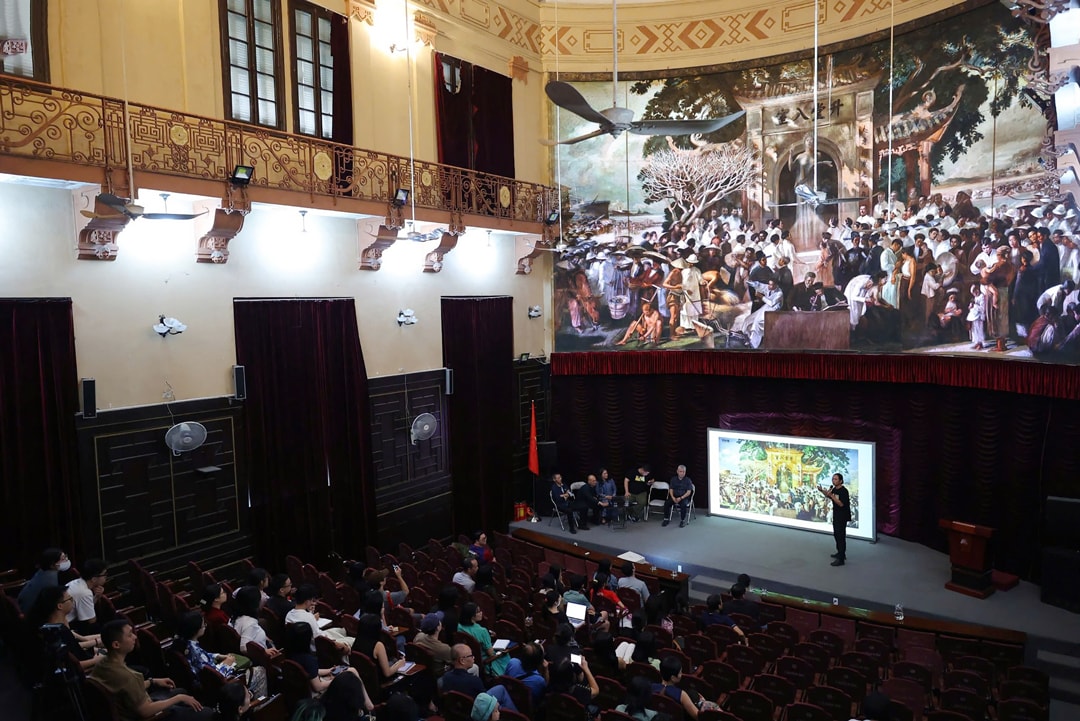 “Nhân vật chính” trong tổ hợp triển lãm là bức tranh khổng lồ của họa sĩ Victor Tardieu có kích thước 11m x 7m với hơn 200 nhân vật khác nhau nằm trong giảng đường Ngụy Như Kon Tum. Từ bức tranh này, một tác phẩm “Thăng đường nhập thất” đã ra đời, đem đến hơi thở đương đại cho tác phẩm gần 100 năm tuổi trên cơ sở dựng lại từ ảnh gốc đen trắng sau đó xử lý bằng công nghệ số. Nhóm tác giả (gồm họa sĩ, nhà nghiên cứu Trần Hậu Yên Thế, nhà nghiên cứu Phạm Long, nghệ sĩ thị giác Triệu Minh Hải và chuyên gia xử lý ảnh Viên Hồng Quang) đã dùng AI để “học” màu qua tranh sơn dầu gốc, sau đó kết hợp video art và chuyển động (animation) để làm bức tranh “sống” lại với cảm giác nhân vật trong tranh “động đậy” hay những dòng nước khẽ chảy.