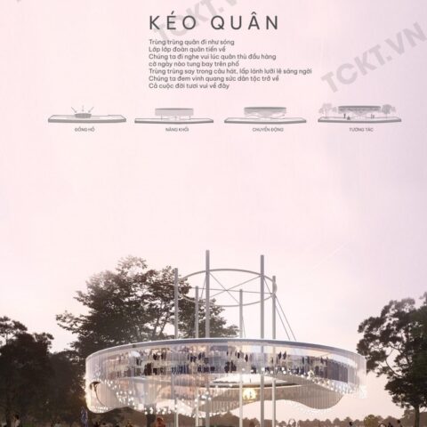 Inspired by the “Kéo quên lantern”, the façade of the design consists of 2 layers moving in opposite directions, making the layers and the images intertwine. “Kéo quân”…
