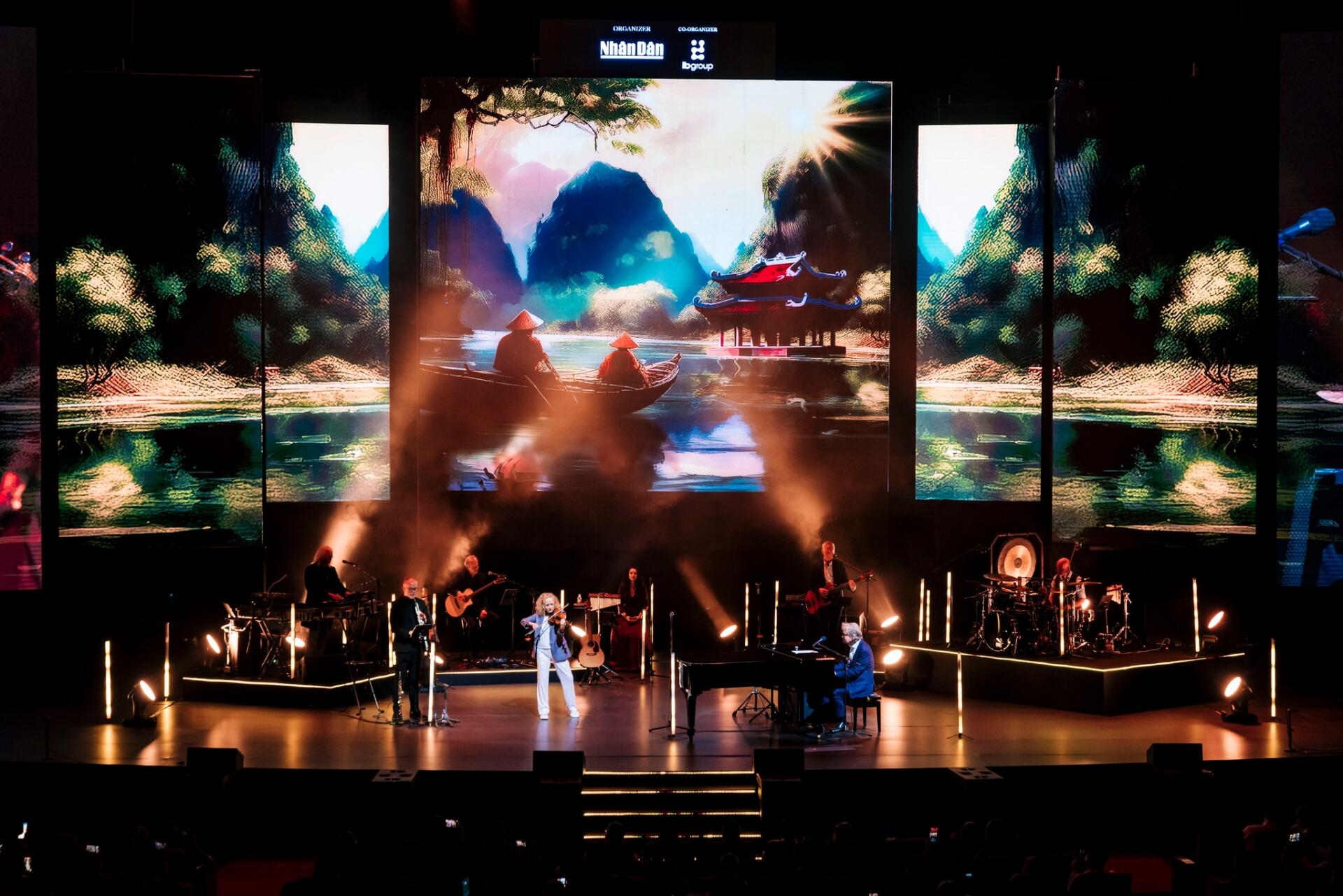 The LED screens integrated advanced visual artistry projection technology, making the performance stage appear shimmering and ethereal, expanded in both width and depth to paint a visually stunning musical picture. Along with graphics deeply connected to the melodies, the appearance of famous Vietnamese landmarks and traditional motifs on the screen also contributed to a performance space imbued with Vietnamese spirit—minimalist yet rich in emotional power.