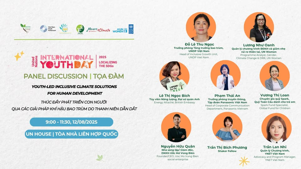 Hưởng ứng Ngày Quốc tế Thanh niên (12/8), Hội thảo Giải pháp khí hậu bao trùm do thanh niên dẫn dắt với nội dung: Thúc đẩy phát triển con người qua các giải pháp khí hậu bao trùm do thanh niên dẫn dắt diễn ra vào 12/08 được UNDP và UN Women tổ chức nhân Ngày Quốc tế Thanh niên 2025. Hội thảo là không gian đối thoại đa chiều, kết nối chuyên gia, doanh nghiệp, tổ chức xã hội và thanh niên, cùng bàn về cách tăng cường đổi mới, hợp tác và huy động nguồn lực, trao quyền cho thanh niên xây dựng giải pháp khí hậu bao trùm vì phát triển con người.