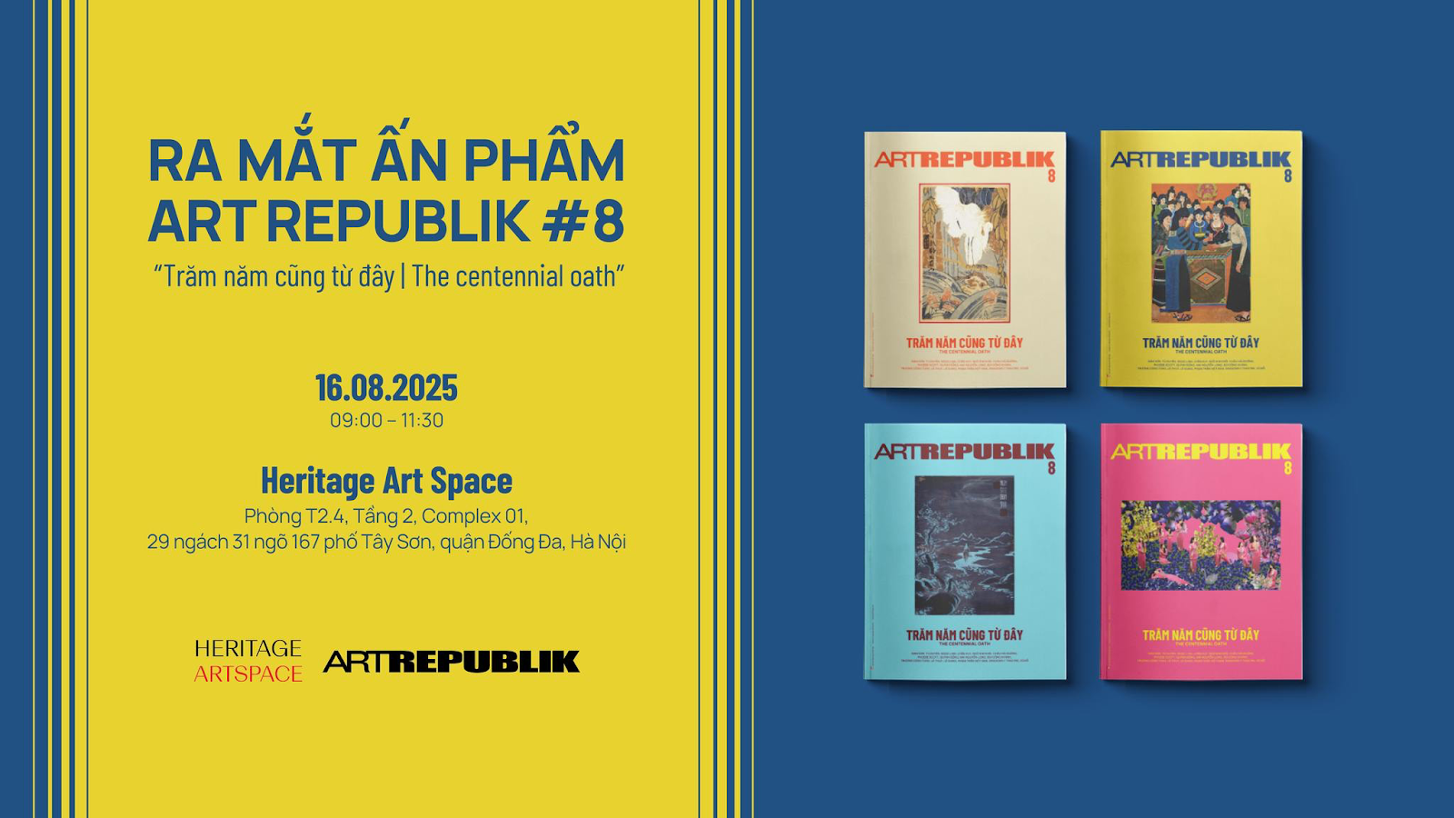 Sáng thứ bảy, ngày 16/8/2025, sự kiện ra mắt ấn phẩm Art Republik #8: Trăm năm cũng từ đây/ The centennial oath đã diễn ra tại Heritage Art Space (COMPLEX 01). Đây là điểm dừng chân tiếp theo sau buổi giới thiệu tại TP. HCM, nối dài hành trình lan tỏa tri thức và kết nối cộng đồng nghệ thuật.