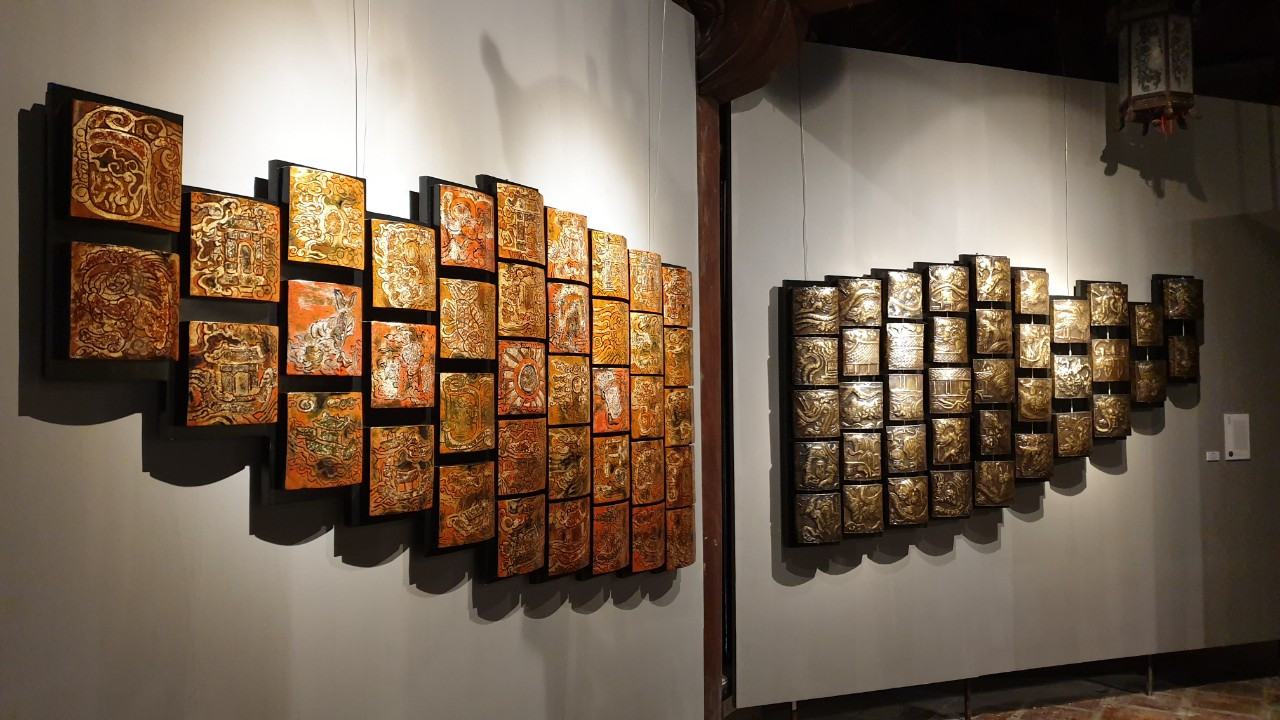 Trong khi đó, tác phẩm “Nghìn xưa lưu dấu” gồm 88 mảnh ghép hình lục lăng, sắp đặt như một bức tường, hội tụ những di sản văn hóa tiêu biểu của người Việt. Theo Tiến sĩ Lê Thị Thanh (Trường Đại học Kiến trúc Hà Nội), tác phẩm “Nghìn xưa lưu dấu” tập hợp nhiều họa tiết cổ, được in dập trên giấy dó.