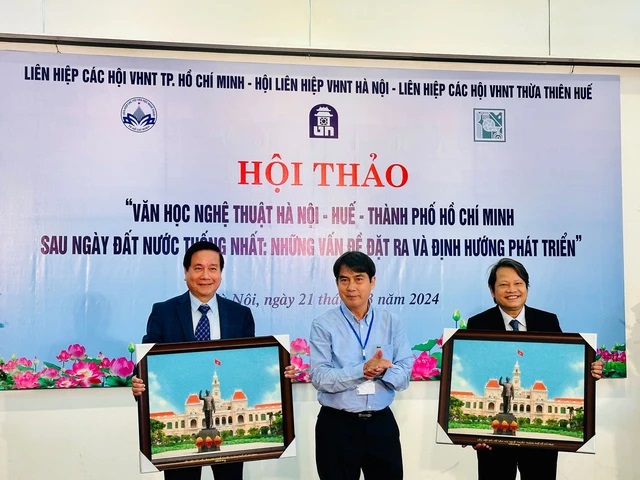 KTS Nguyễn Trường Lưu, Chủ tịch Liên hiệp các Hội VHNT TP HCM, trao tặng 2 món quà của TP HCM cho đại biểu TP Hà Nội và Huế tại hội thảo