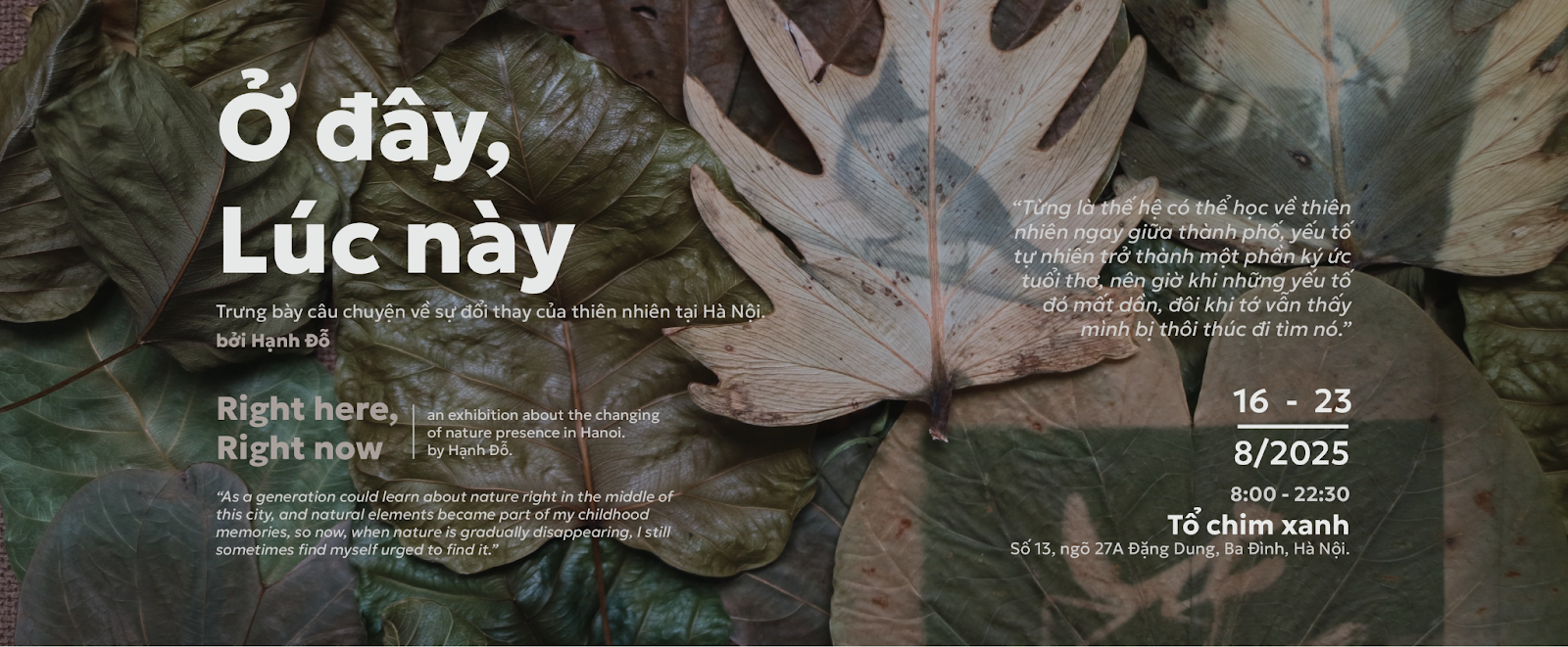 Sinh ra và lớn lên tại Hà Nội, tác giả của triển lãm “Ở đây, Lúc này” mang trong mình ký ức sâu đậm về một Hà Nội nhiều cây xanh, trong lành và chan hòa thiên nhiên. Những năm 1995–2002, khi tác giả sống tại khu tập thể Giảng Võ, ký ức tuổi thơ được bao bọc bởi sắc trời xanh, ánh nắng vàng trong trẻo, những đợt gió mùa se lạnh, tiếng côn trùng rộn rã và hương thơm mát lành của thiên nhiên.